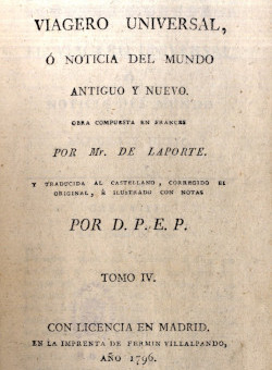 • Estala, Pedro. El viagero [sic] universal o Noticia del mundo antiguo y nuevo. Madrid, 1796. Enlace al catálogo