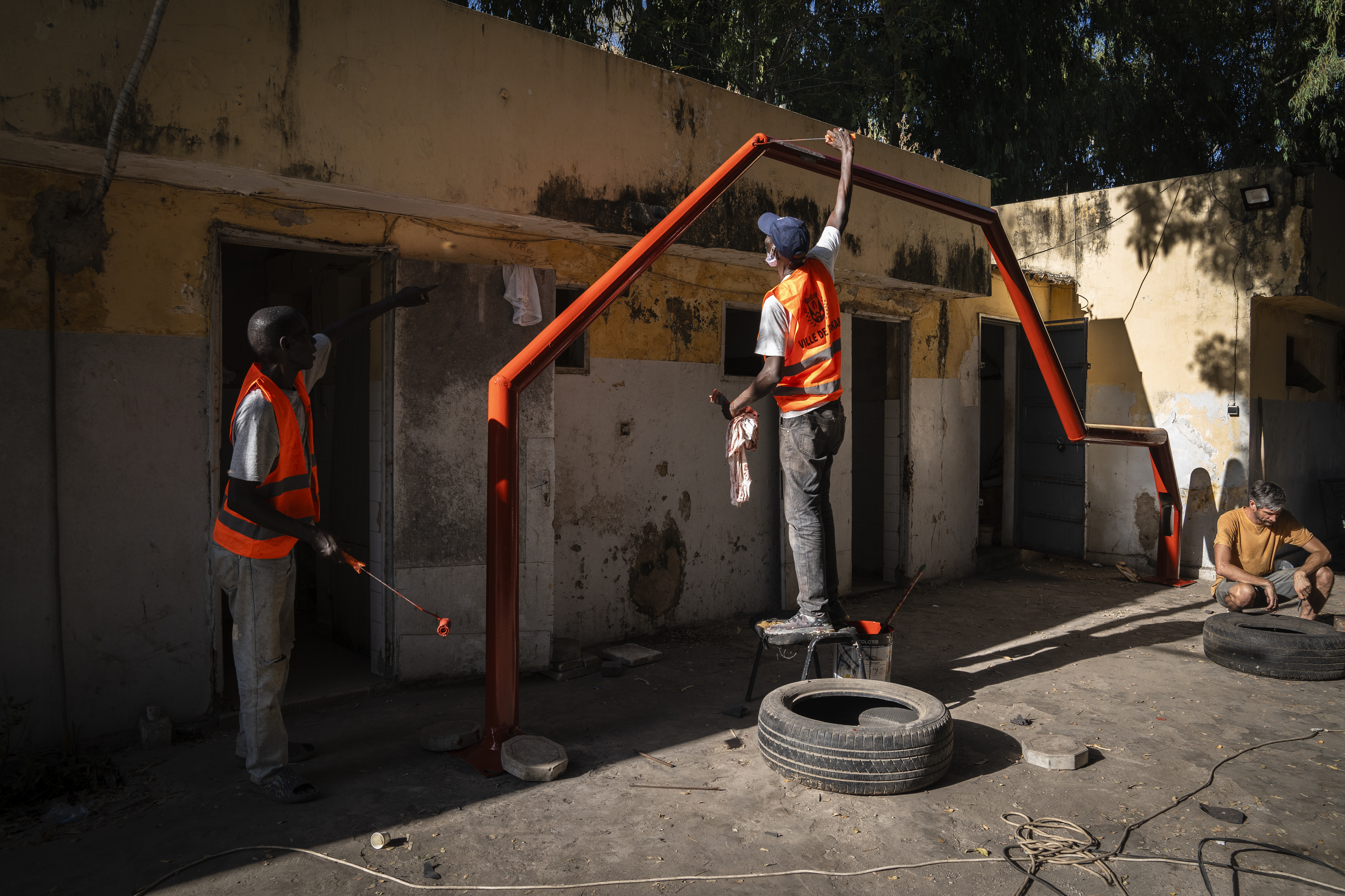 Los novios ignoran que el decorado utilizado para el posado nupcial está realizado con residuos urbanos que, hasta la semana pasada, estaban apilados y acumulando polvo en un depósito municipal. Restos de farolas rotas, neumáticos deteriorados y otros elementos metálicos inservibles componen el nuevo espacio de juego del ayuntamiento de Dakar. La estructura metálica recientemente instalada en el jardín del consistorio es el primer prototipo creado para reactivar los 55 espacios urbanos vacíos y en desuso identificados por el departamento de urbanismo e infraestructuras con el fin de rediseñar y dinamizar los espacios públicos de la ciudad.