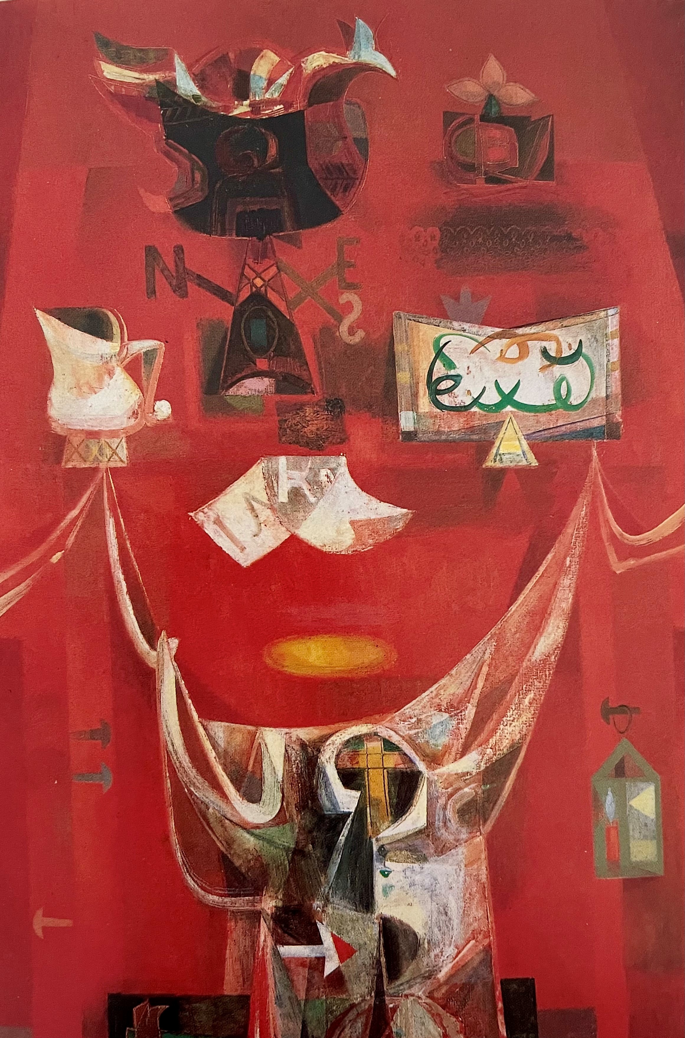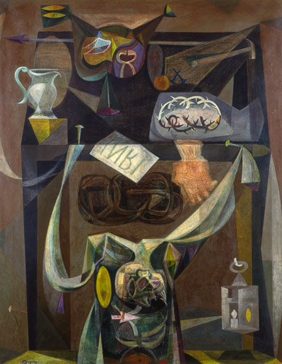 Durante su estancia en Francia, Obregón realiza Mesa del Gólgota (ca.1952), obra que marca un punto de inflexión en su carrera. En ella incorpora un lenguaje simbólico que perdurará en su producción posterior y se consolida como una pieza clave dentro de su etapa modernista de los años cincuenta. La pintura propone una interpretación intensa de la Pasión de Cristo: la corona de espinas, los clavos que sostienen un paño y el letrero INRI articulan una visión espiritual y fragmentada de la crucifixión, muy alejada de la representación tradicional.